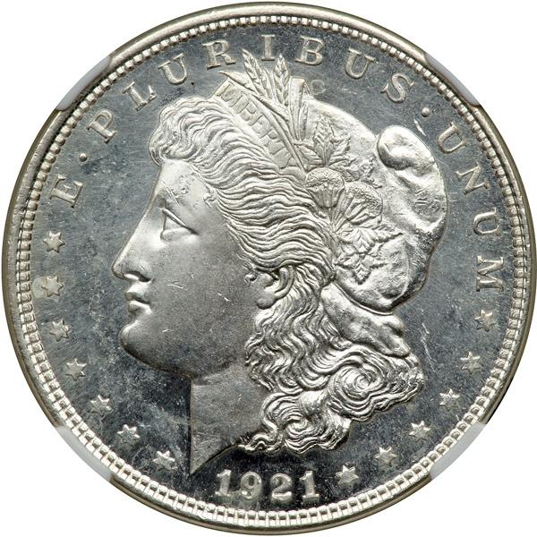 1921 Morgan Dollar. NGC graded MS-65 Deep Mirror Prooflike. Well struck and totally white with nice mirror surfaces. Sleek in color frosty devices seesaw with the surrounding field whose reflective quality is unusual to find in a 1921 Morgan Silver Dollar. At best, it is not easy even a baggy prooflike specimen. So too crisp definition on the main devices counts for a lot. Mathematically exact standards are seen in the sharp hair curls and so too, the eagle's plumage. Pop 7; none finer.