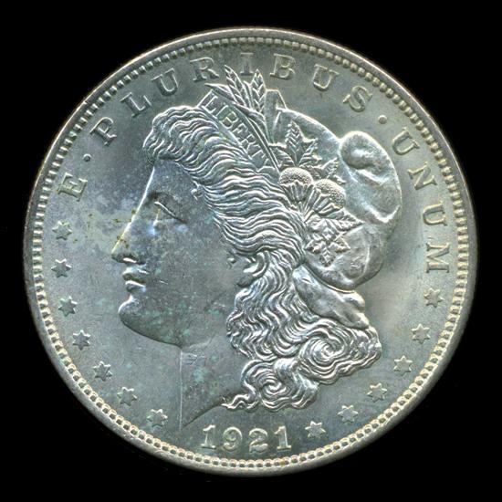 Excellent MS65 with unlisted filled G in GOD on reverse (listed for other years but not 1921); RARE; $200+ BV