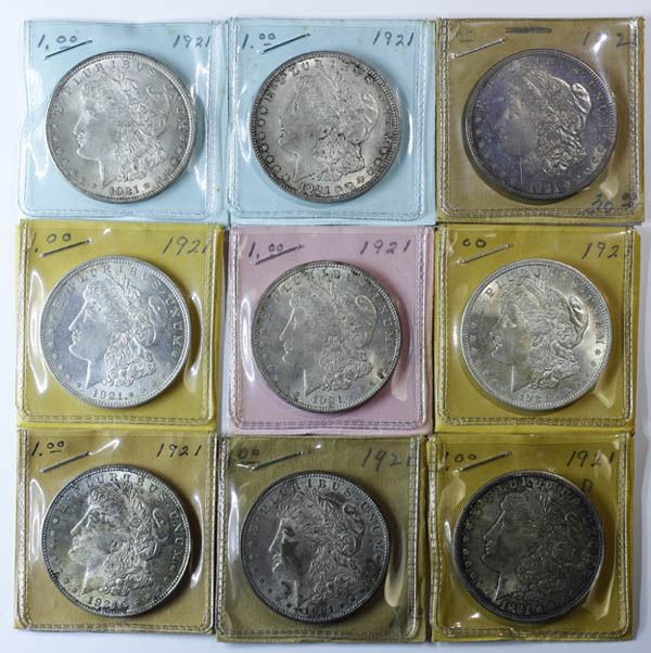 1921 Morgan Dollars, 9 pieces. Almost Uncirculated to Uncirculated. 1921 8, 1921-D.