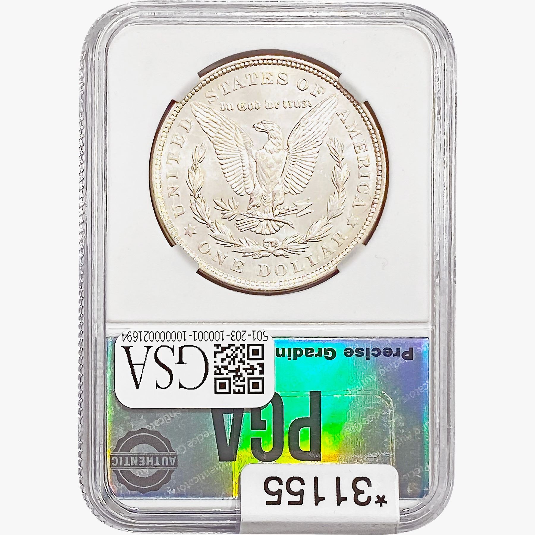 COINS AND CURRENCY LISTED IN GSA’S CATALOG AS GRADED AND ENCAPSULATED BY PCGS, NGC, ANACS, ICG, PCGS CURRENCY, PMG, PCGS BANKNOTE GRADING, CMC OR ANY OTHER THIRD-PARTY GRADING SERVICE ARE LIKEWISE SOLD “AS-IS” EXCEPT AS EXPRESSLY SET FORTH HEREIN. ALL THIRD-PARTY GRADING SERVICE GUARANTEES, INCLUDING AUTHENTICITY, ARE THE SOLE RESPONSIBILITY OF THE THIRD-PARTY GRADING SERVICE AND NOT WARRANTIES OR GUARANTEES OF GSA. BIDDERS SHOULD CONTACT THESE THIRD-PARTY GRADING SERVICES DIRECTLY WITH RESPECT TO ANY CLAIMS OR QUESTIONS THEY MAY HAVE CONCERNING THEIR GUARANTEES AND WARRANTIES. BIDDERS ACKNOWLEDGE AND AGREE THAT AUCTIONEER IS NOT BOUND BY OR LIABLE FOR ANY OPINION OR CERTIFICATION BY ANY THIRD-PARTY GRADING SERVICE. REMOVAL OF A PRODUCT FROM ITS PROTECTIVE CASING OR HOLDER OR ALTERATION OF ANY COIN HOLDER WAIVES ALL RIGHTS CONCERNING THE PRODUCT CONTAINED THEREIN.