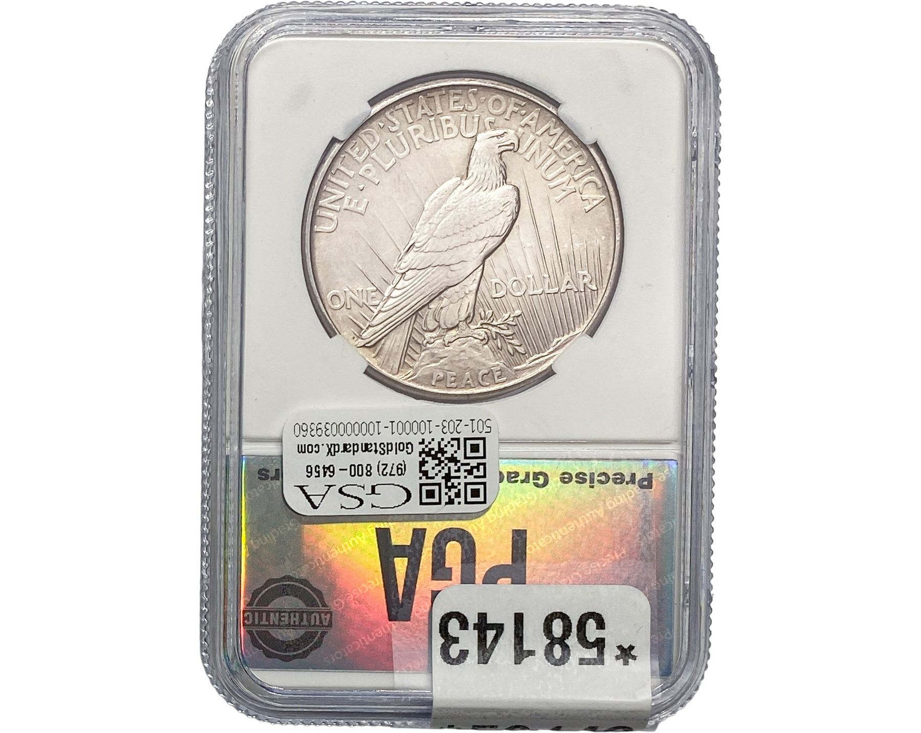 e. Coins sold referencing a third-party grading service are sold “AS IS” without any express or implied warranty, except for a guarantee by GSA that they are genuine. Removal or alteration of the holder, voids all of Bidder’s claims concerning that Product. Certain warranties may be available from the grading services and Bidders are referred to them for further details: Numismatic Guaranty Corporation (NGC), PO Box 4776, Sarasota, FL 34230, www.ngccoin.com/services/writtenguarantee.asp; Professional Coin Grading Services (PCGS), PO Box 9458, Newport Beach, CA 92658, www.pcgs.com/guarantee.html; ANACS, 6555 S. Kenton St., Ste. 303, Englewood, CO 80111; and Independent Coin Grading Co. (ICG), 7901 East Bellview, Ave., Suite 50, Englewood, CO 80111.