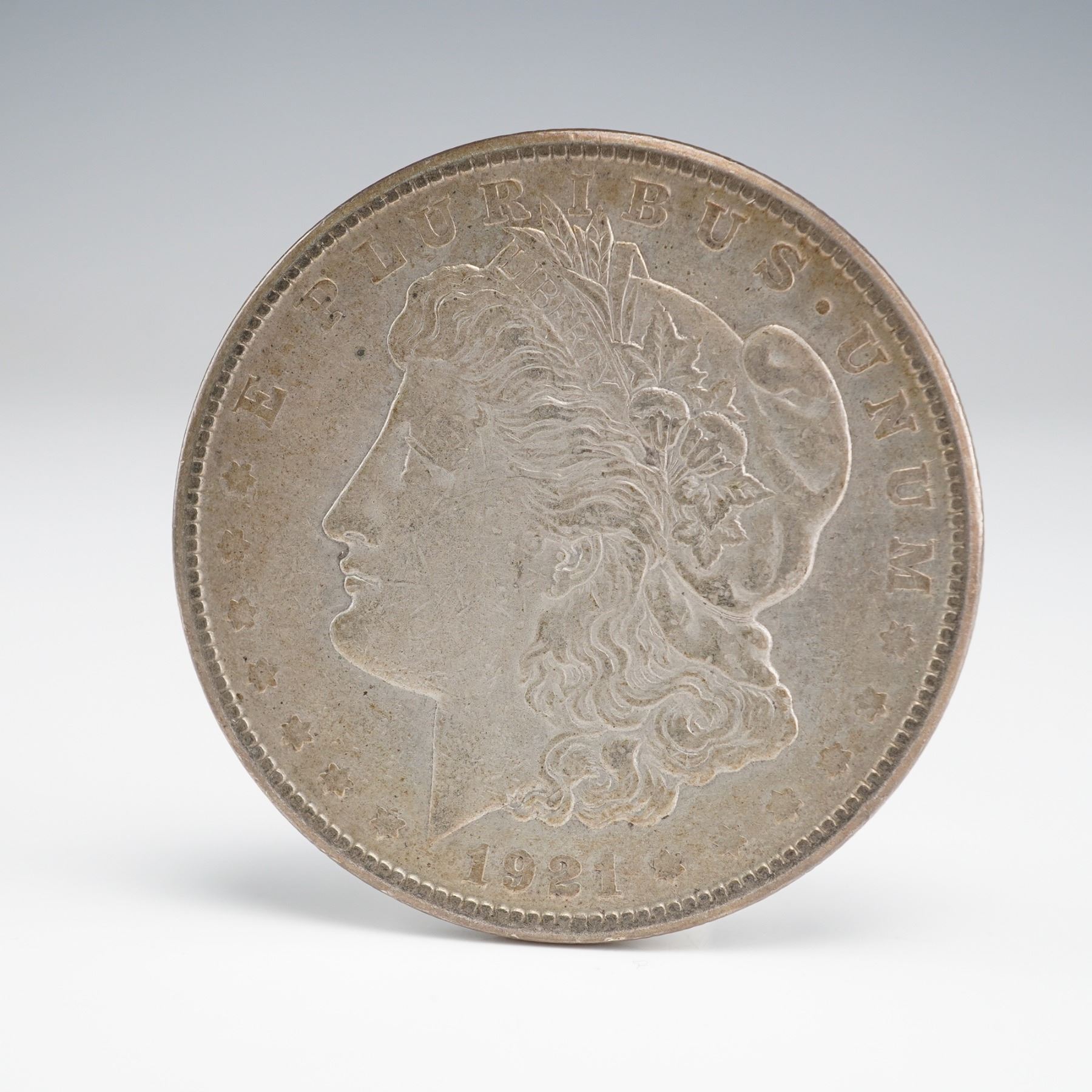 A 1921 Morgan Silver Dollar. Obverse: Liberty profile, E PLURIBUS UNUM. Reverse: Eagle with olive branch and arrows, UNITED STATES OF AMERICA, ONE DOLLAR, In God we trust.