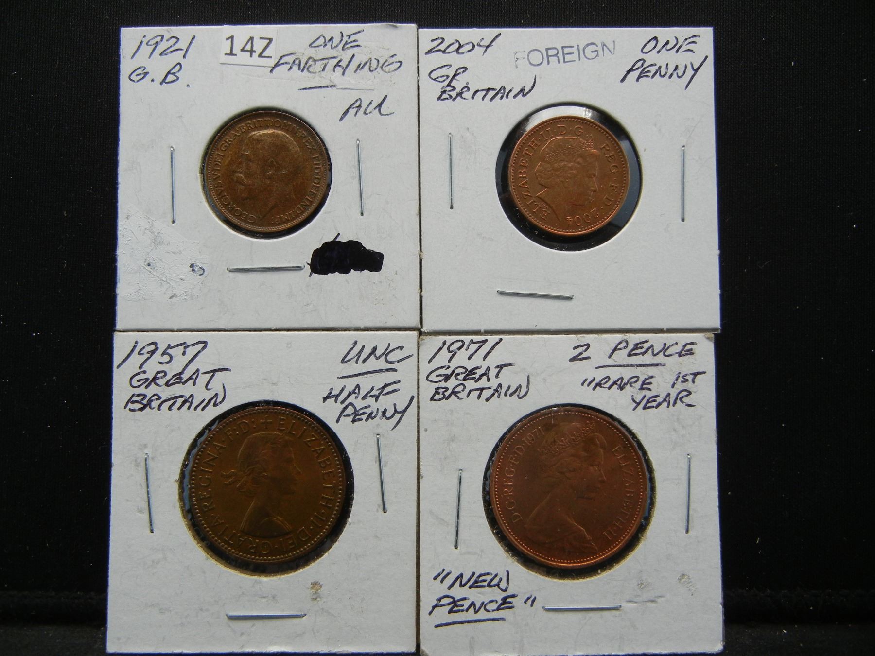 1921 One Farthing, 1957 Half penny, 1971 Two Pence, 2004 One Penny, ALL From Great Britain