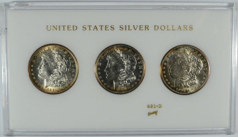 1921 P,D & S MORGAN SILVER DOLLARS IN PLASTIC HOLDER, ALL CHOICE BU, TONING