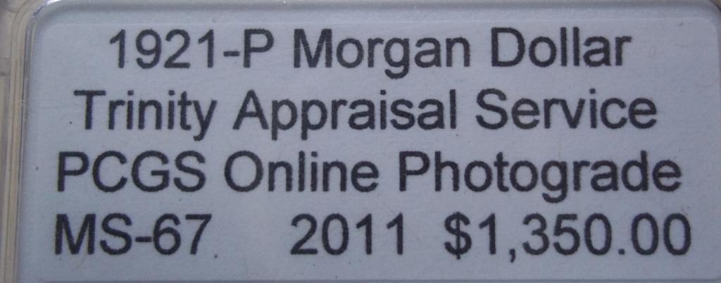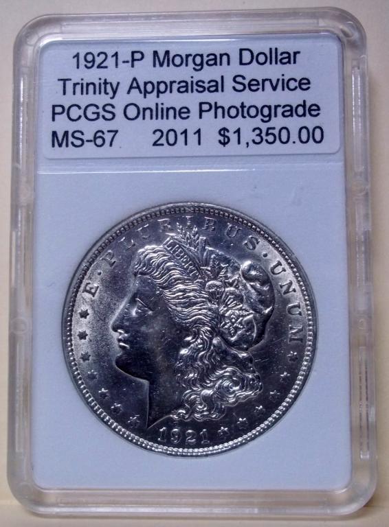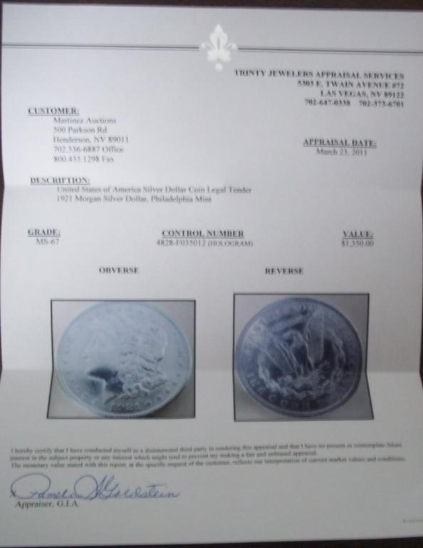 1921 Morgan Silver Dollar, Philadelphia Mint, MS-67. PCGS Online Photograde. Appraised by Trinity Jewelers Appraisal Services. Control # F035023 Value: $1,350.00