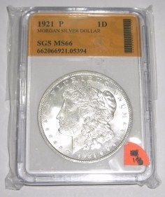 1921-P Morgan Silver Dollar *RARE MS-66 CERTIFIED BY SGS* Serial #662066921.05394!! Coin comes with a Certificate of Authenticity! ***Coin, Currency & All Items Listed in this auction - Grades, Conditions and Values are not Safe Deposit Coins LLC Responsibilty. Grades, Condition and Values are determined by Consigner(s) & Buyers ONLY***