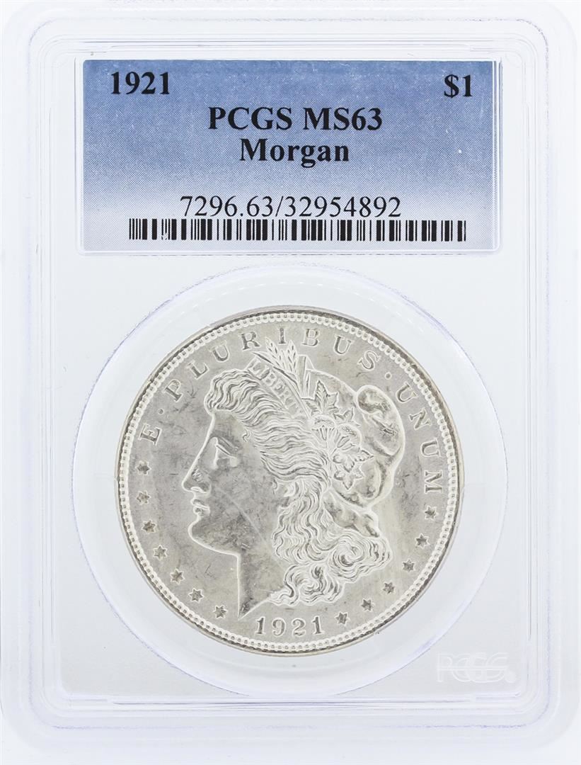 One 1921 PCGS MS63 Morgan Silver Dollar PCGS Certified.