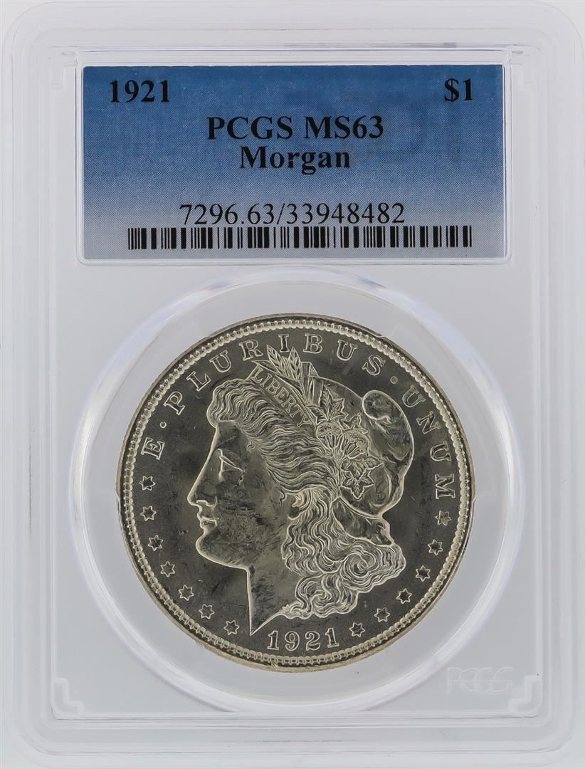 One 1921 PCGS MS63 Morgan Silver Dollar. PCGS Certified.