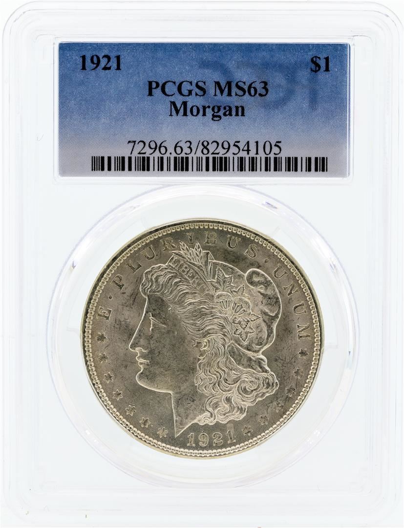 One 1921 PCGS MS63 Morgan Silver Dollar.