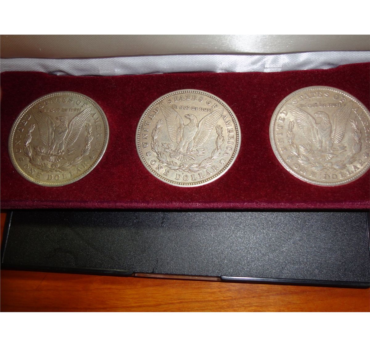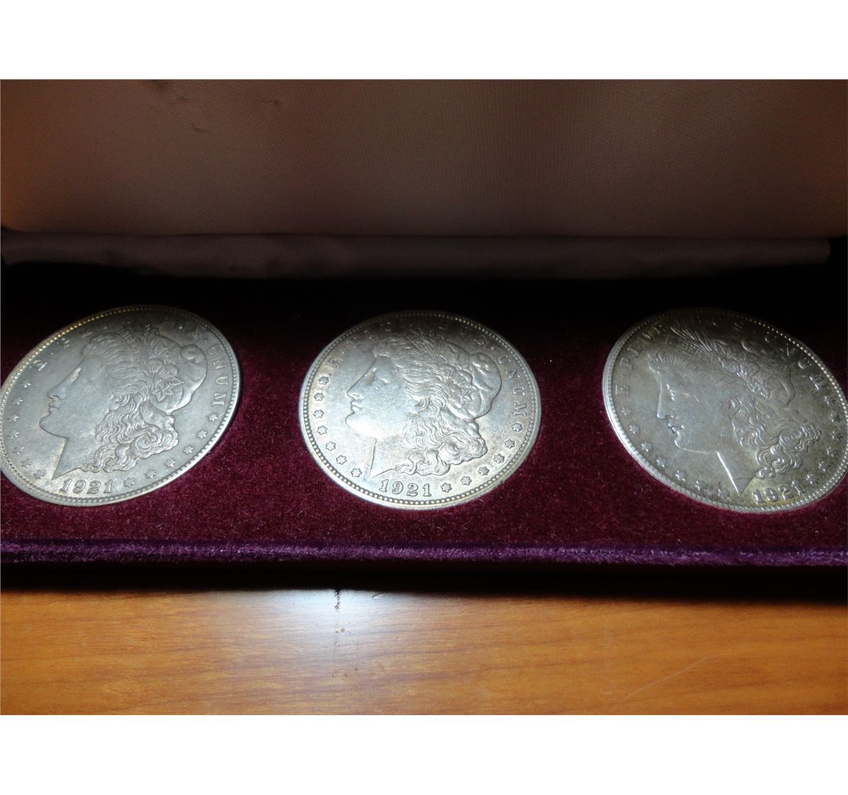 1921 PDS SET OF 3 MORGAN SILVER DOLLARS IN CASE ALL XF