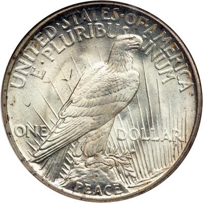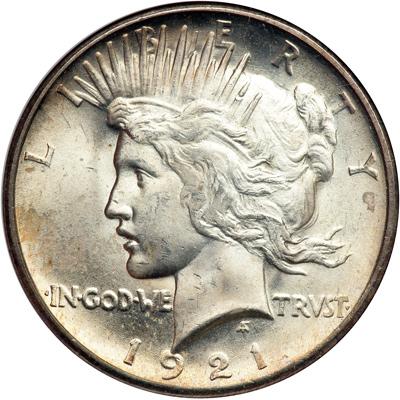 1921 Peace Dollar. NGC graded MS-63. Intensely frosty mint surfaces with touches of light golden toning. A blunt impression is sometimes left by the recoil of the dies that struck the 1921 High Relief dollars of 1921; all the same, we can report that this specimen, unlike the others, is outstanding in its detail and sharpness.