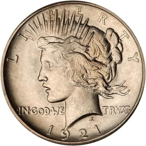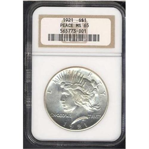 <b>1921 Peace Dollar. NGC graded MS65.</b> The powerful impression given by the lustrous surfaces are readily appreciable at all angles. This is an important issue among Gem quality Peace dollar collectors. Substantial detail to the highpoints on this fine example, with a thorough and effectual imprint from the dies almost complete in the hair and eagle; there are only marginal weak areas left from the recoil of the dies, and these can be easily ignored. If you need a prestigious 1921 high relief dollar for your set, do not hesitate to bid, and don't bid meekly since others will call your bluff. You won't get until tomorrow, either, since once it sells, there may not be another like it for some time <b>(PCGS # 7356)</b>