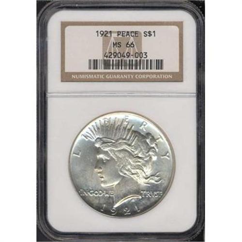 <b>1921 Peace Dollar. NGC graded MS66.</b> This coin radiates attractive silver color like an ice storm of winter, with no detracting marks or problems. On the high relief image of Liberty and the eagle, everything is sharp in all areas, as struck, as desired by collectors, which the grading service has taken into consideration in assigning the grade, as also desired by collectors. Don't miss this remarkable MS66 specimen <b>(PCGS # 7356)</b>