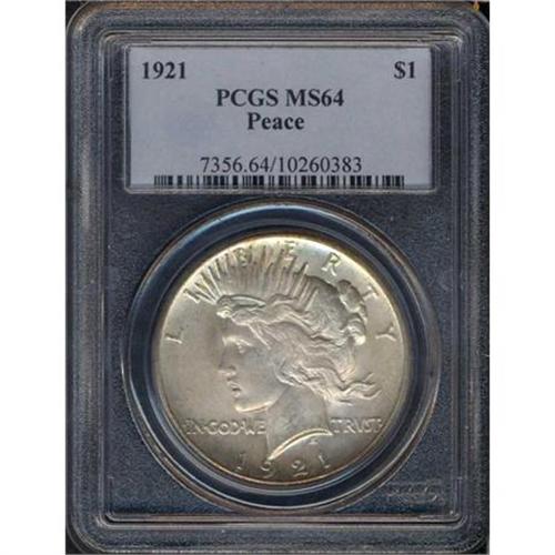 <b>1921 Peace Dollar. PCGS graded MS64.</b> As the first year high relief design this is a solid MS64 in all regards. The frosty surfaces are alight with smooth luster, the strike is clear-cut in many areas but typically soft at the center, but best of all, the eye appeal is nothing short of exceptional <b>(PCGS # 7356)</b>