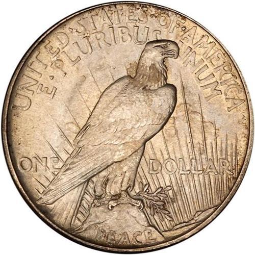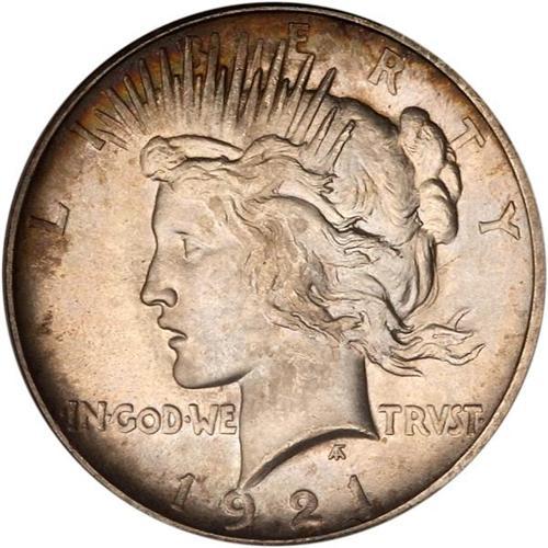A resplendent example of Anthony De Francisci's new design and the only affordable date in high relief. George T. Morgan, Mint Engraver at the time and whose own design had been replaced by De Francisci's, lowered the relief of the electroplate model <i>by hammering it with a flat board! </i>The subsequent lower relief was used for the remaining issues of Peace Dollars, 1922 to 1935. Morgan elected to further cut down the relief by lessening the striking pressure on the coin presses, ostensibly to reduce die wear. In a similar fashion to the beautiful 1907 High Relief Double Eagles, De Francisci's beautiful 1921 was thus greatly modified to adapt it to normal coin production. Unfortunately, it is impractical to strike each coin with several blows from the dies to bring up the high relief. It is also not practical to increase striking pressure to the point where the dies wear rapidly and breakage occurs. As with other high relief designs, the mint had to compromise the artist's concept to meet the demands of efficient coin production <b>(PCGS # 7356)</b> <i>