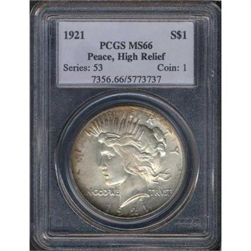 <b>1921 Peace Dollar, High Relief. PCGS graded MS66.</b> Nice peripheral toning on otherwise ice-cold white surfaces, the fresh gleam off the dies streaks across the fields of this handsome patinated coin. About as fully struck as these 1921 high relief Peace dollars are normally found, with just a trace of weakness at the centers, but near-pristine surfaces from the center outwards.