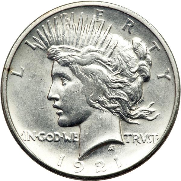 1921 Peace Dollar. MS-60. Untoned with characteristic satiny frost this high-relief date is noted for.
