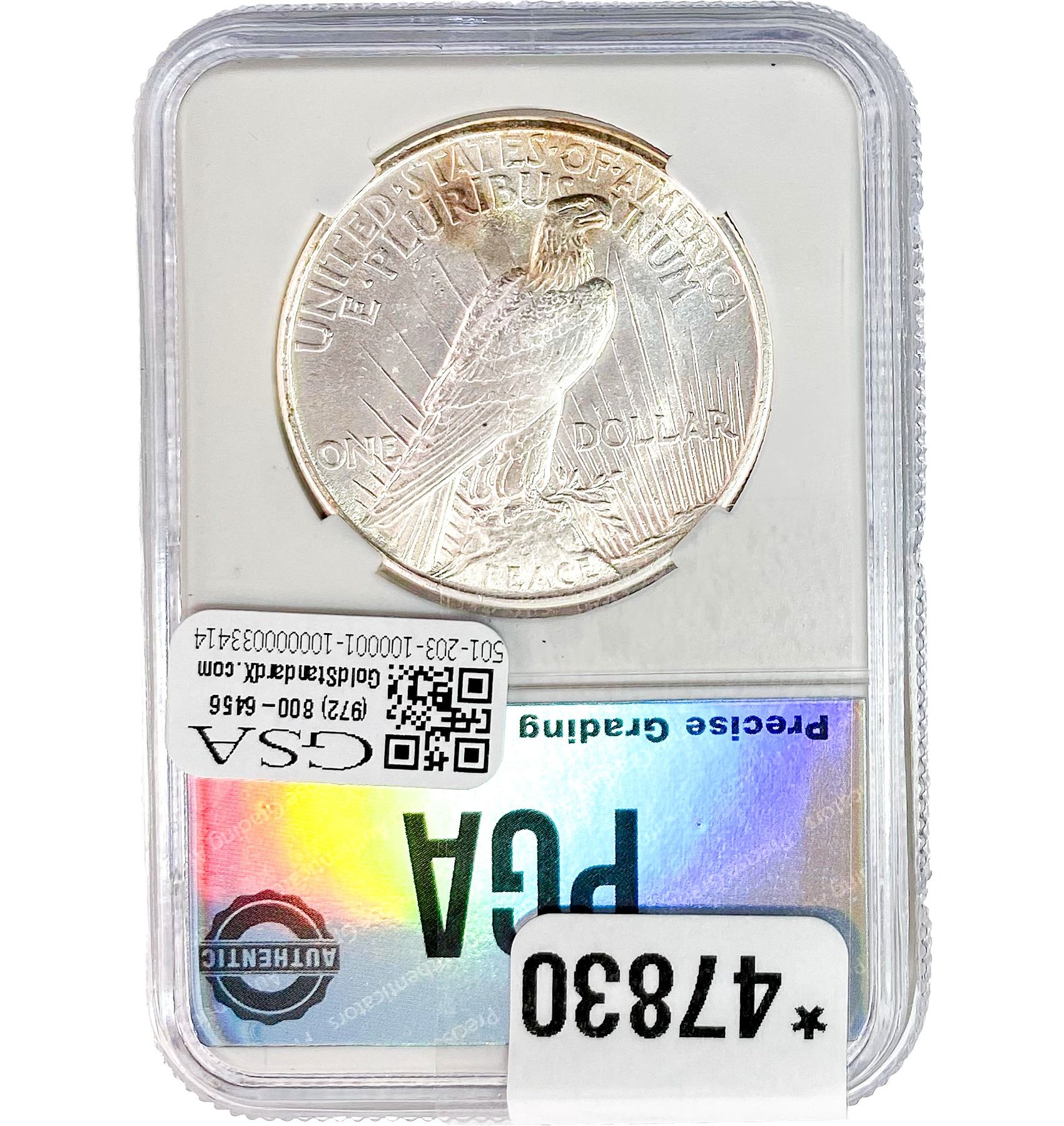 e. Coins sold referencing a third-party grading service are sold “AS IS” without any express or implied warranty, except for a guarantee by GSA that they are genuine. Removal or alteration of the holder, voids all of Bidder’s claims concerning that Product. Certain warranties may be available from the grading services and Bidders are referred to them for further details: Numismatic Guaranty Corporation (NGC), PO Box 4776, Sarasota, FL 34230, www.ngccoin.com/services/writtenguarantee.asp; Professional Coin Grading Services (PCGS), PO Box 9458, Newport Beach, CA 92658, www.pcgs.com/guarantee.html; ANACS, 6555 S. Kenton St., Ste. 303, Englewood, CO 80111; and Independent Coin Grading Co. (ICG), 7901 East Bellview, Ave., Suite 50, Englewood, CO 80111.