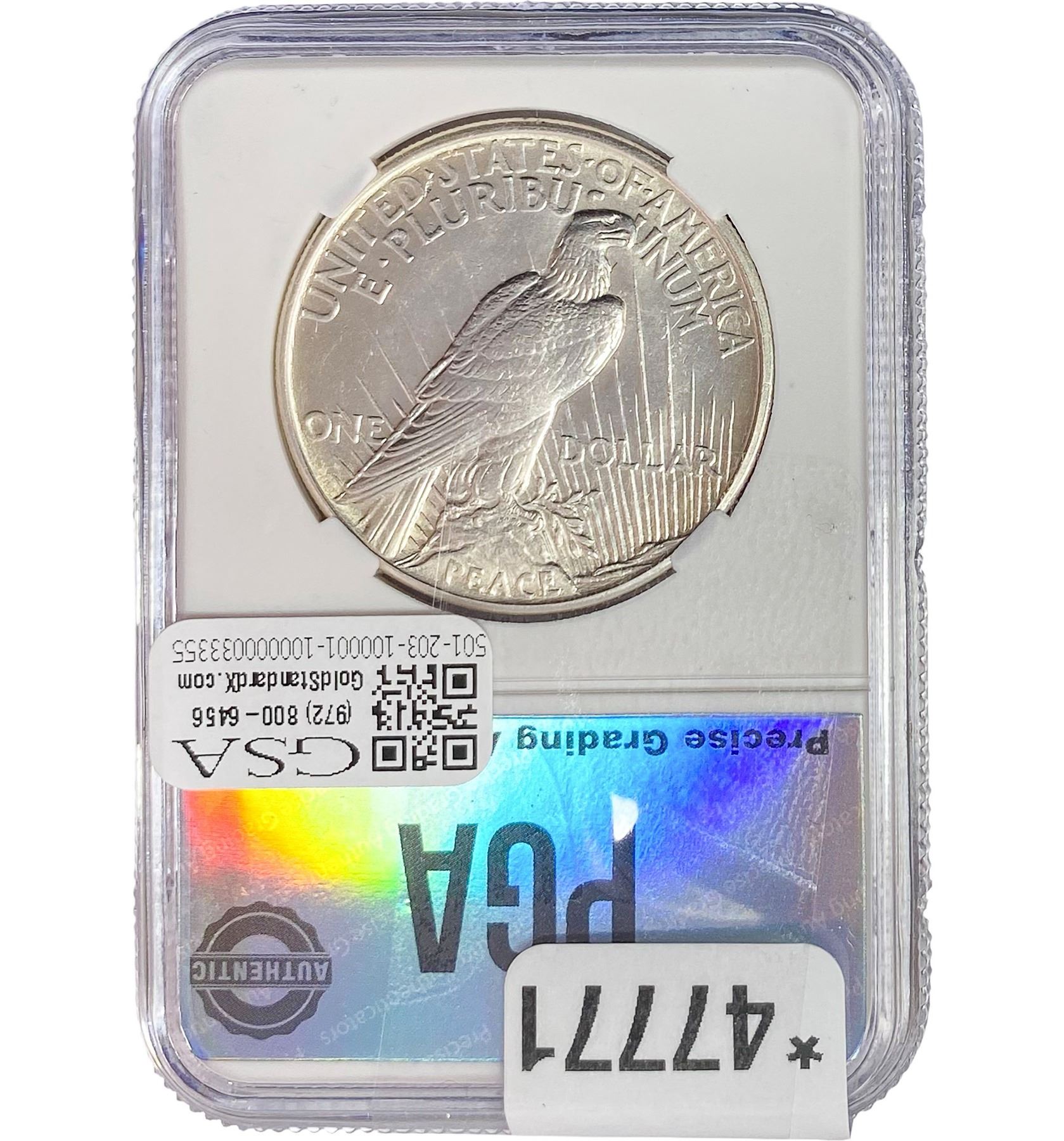 e. Coins sold referencing a third-party grading service are sold “AS IS” without any express or implied warranty, except for a guarantee by GSA that they are genuine. Removal or alteration of the holder, voids all of Bidder’s claims concerning that Product. Certain warranties may be available from the grading services and Bidders are referred to them for further details: Numismatic Guaranty Corporation (NGC), PO Box 4776, Sarasota, FL 34230, www.ngccoin.com/services/writtenguarantee.asp; Professional Coin Grading Services (PCGS), PO Box 9458, Newport Beach, CA 92658, www.pcgs.com/guarantee.html; ANACS, 6555 S. Kenton St., Ste. 303, Englewood, CO 80111; and Independent Coin Grading Co. (ICG), 7901 East Bellview, Ave., Suite 50, Englewood, CO 80111.