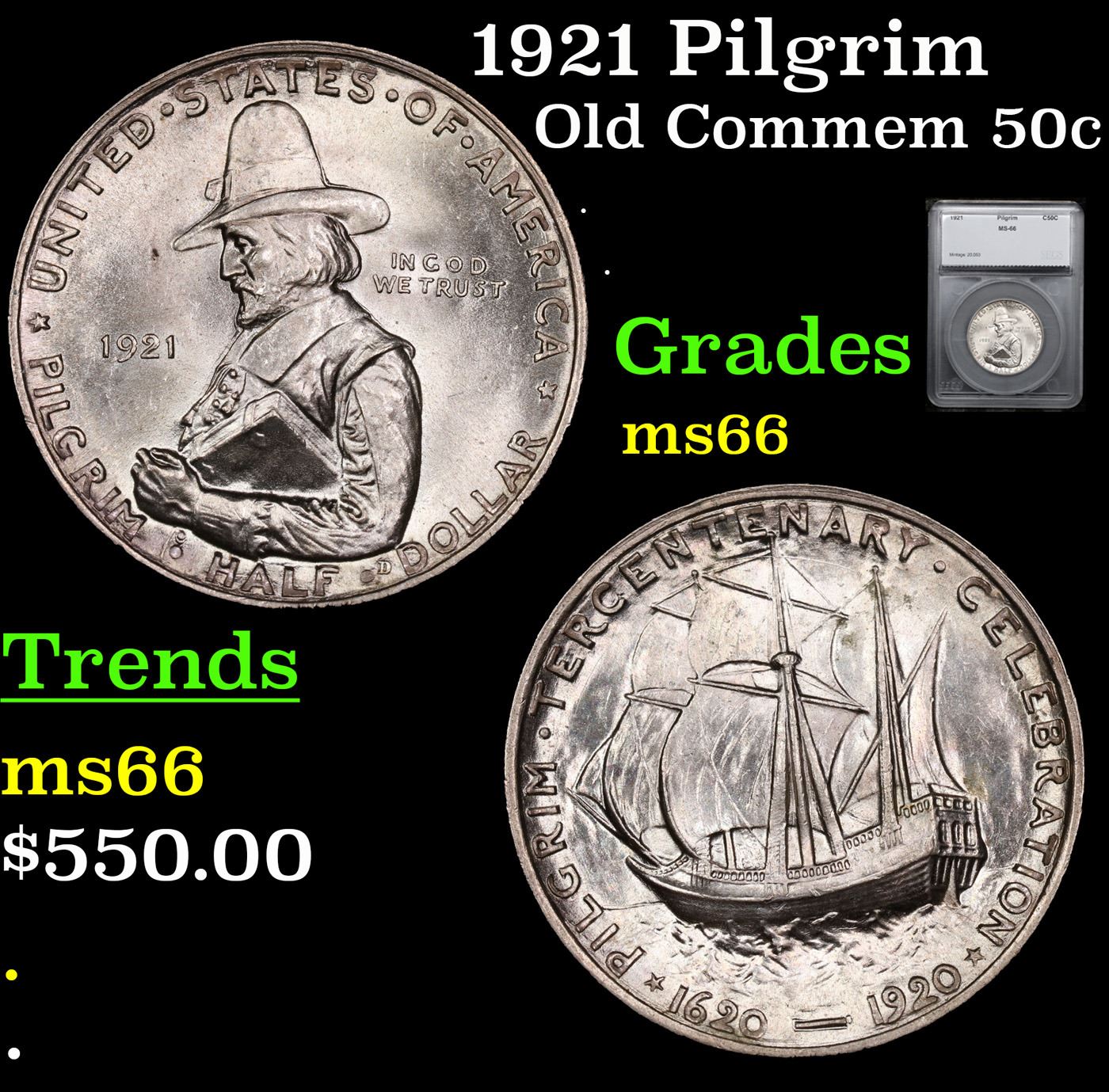 1921 Pilgrim Old Commem Half Dollar 50c Graded ms66 By SEGS. When Examining a 1921 Pilgrim, Look for Wear on the Crow's Nest and on the Cheek Bone on the Obverse as these are the High Points.