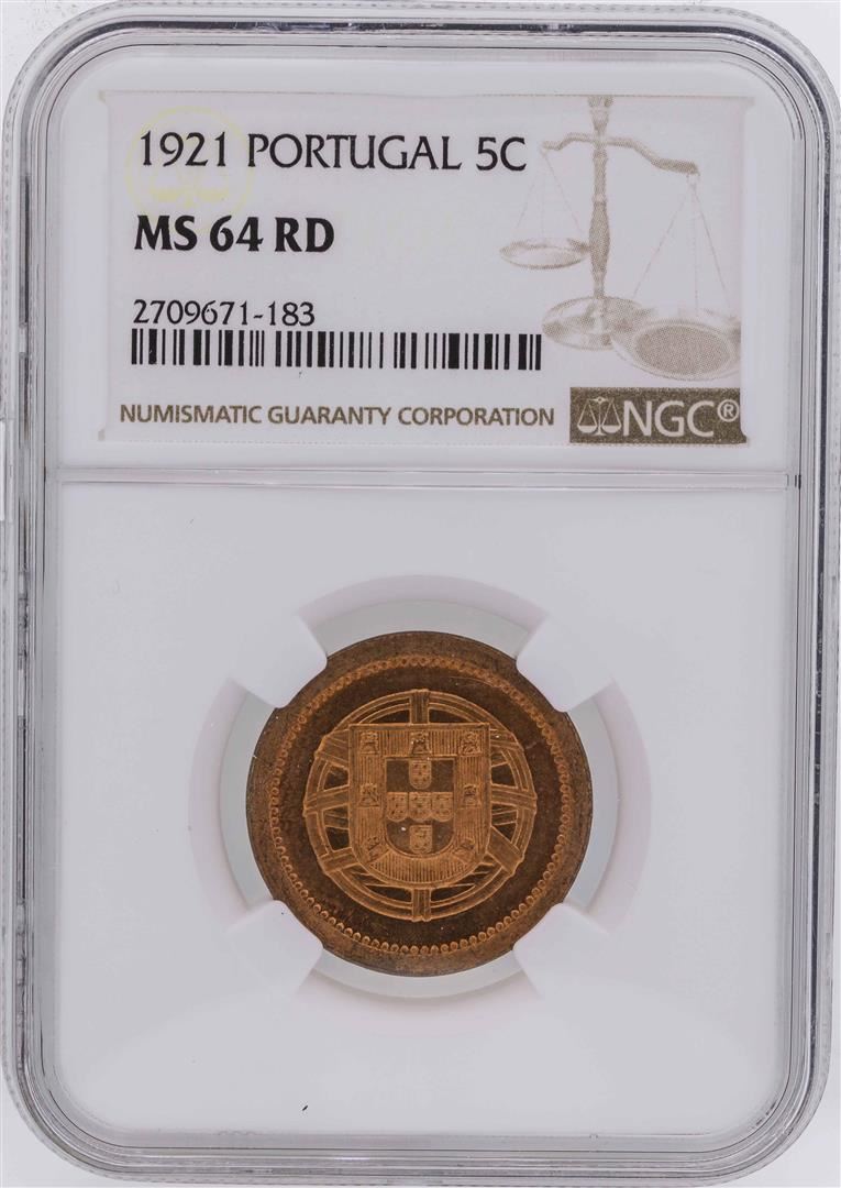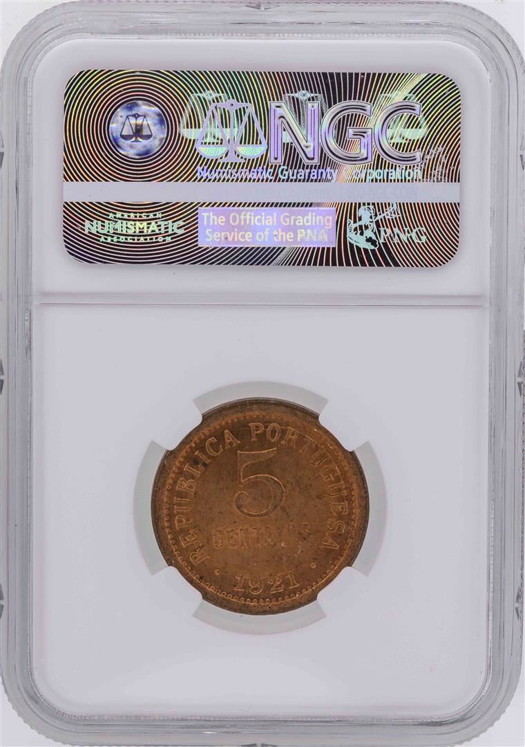 One 1921 Portugal 5 Centavos Coin NGC MS64RD. NGC Certified.