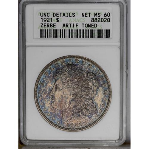 <B>1921<img border='0' src='http://www.heritagecoins.com/images/star.gif' width=10 height=10>$1> Zerbe--Artificially Toned--ANACS. Unc Details, Net MS60.</B></I> The diagnostics for a Zerbe proof (Breen, 1977) are present on this piece, but faint. But then, ANACS is not claiming this is a Zerbe proof, just a Mint State piece struck from Zerbe proof dies. The striking details are exceptionally strong, though, with complete detailing in the center of the obverse and reverse as well as the reverse wreath. The fields are noticeably prooflike, even through the deeply mottled cobalt-blue and rose toning (that does indeed look suspicious).<BR><I>From The David L. Goodwin Collection.</B></I> <BR><BR><B>Important notice:</B> Heritage usually auctions material at the rate of 200-250 lots per hour. On some occasions eBay Live bid software or the Internet may not be able to keep up with the pace of the auction. We recommend placing a realistic absentee bid now as insurance to avoid disappointment. Occasionally the auctioneer may eliminate or reject an eBay Live bid, and the auctioneer may also reopen a lot after the close of the eBay live bidding (usually because we missed an audience bid), and may reject your bid even if it shows you as the winning bidder. By bidding via eBay Live, you agree that Heritage may award the lot to another bidder at its sole discretion under the circumstances described above or any other reasonable circumstances. Since eBay bids are not shown to us until we open the lot on the floor, we treat those bids just like floor bids. In most cases the floor responds before the eBay bid is presented to us, due to Internet lag time, so for consistency we have made it a policy that floor bids are always considered first over tie eBay live bids. Also please note that all Heritage lots purchased through eBay Live carry a 20% Buyer's Premium. Please make sure you read the Terms and Conditions before you bid. This lot is being auctioned in conjunction with a live floor auction by Heritage Galleries & Auctioneers. All final auction and invoice information will be supplied by Heritage Galleries & Auctioneers, and all other information should be considered preliminary. Lot:3791 <BR><BR><B>Winning Notification and Billing:</B> After the FINAL session in this auction is complete, Heritage will send e-mail and snail mail invoices. This process normally takes several days. All final auction and invoice information will be supplied by Heritage Galleries & Auctioneers, and all other information should be considered preliminary. <BR><BR>This auction will be conducted on a live auction floor and over the Internet through eBay Live. If you choose to place an absentee bid, please take a moment to <font color='#0000ff'><u><a href='http://pages.ebay.com/liveauctions/help/before/laabsentee.html'>learn how eBay Live absentee bidding works</a></u></font><font color='#000000'>