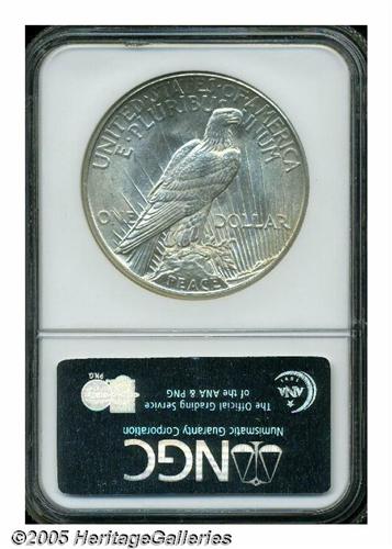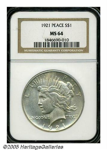<B>1921<S$1> MS64 NGC.</B></I> A lustrous apricot-gray representative, the strike is not full in the center, but the details are better than often encountered for the strike-challenged issue. The obverse is remarkably close to pristine, and the few trivial marks on the reverse do not appear to limit the grade.