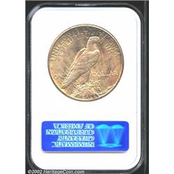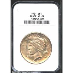 1921 S$1 MS64 NGC. Dusky lemon-gold patina. A lustrous and impressively preserved near-Gem. The centers are not fully struck, as is usually the case with this high relief issue. Die clash lines (as struck) are observed below UNUM. Important notice: We expect to be auctioning lots at the rate of 200-250 per hour. Sometimes eBay Premier live bid software cannot keep up with that pace, so we strongly recommend that you place a realistic proxy bid now as insurance to avoid disappointment. Also please note that all Heritage/CAA lots purchased through eBay Premier carry a 20% Buyer's Premium. Please make sure you read the Terms and Conditions.
