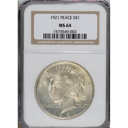 <B>1921 S$1 MS64 NGC.</B></I> Firmly struck if typically flat over Liberty's ear. Faint apricot accents highlight the cream-gray surfaces. A reeding mark is noted just above Liberty's jaw, and a few smaller blemishes are scattered throughout.<BR><BR><b>Shipping:</b> Coins & Currency (<a target="_blank" href="http://www.heritageauctions.com/common/shipping.php">view shipping information</a>)