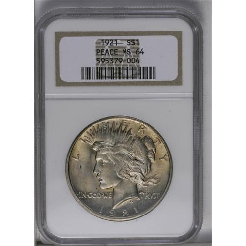1921 S$1 MS64 NGC. Satiny luster covers the surfaces,