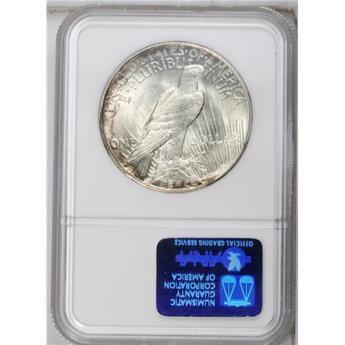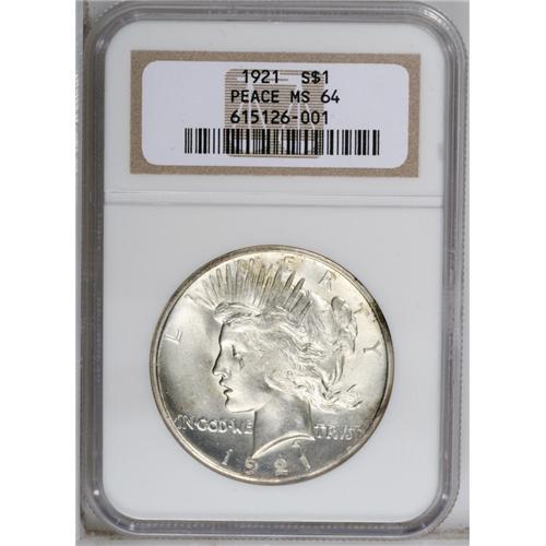1921 S$1 MS64 NGC. The satiny silver-gray surfaces hav
