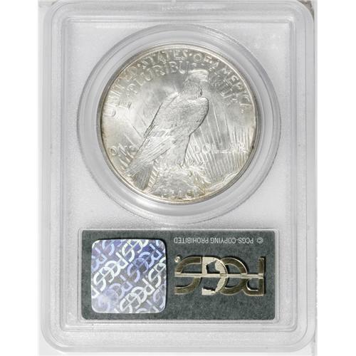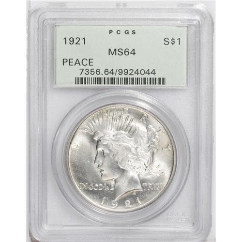 <B>1921<img border='0' src='http://www.heritagecoins.com/images/star.gif' width=10 height=10>$1> MS64 PCGS.</B></I> Dazzling luster and refreshingly smooth surfaces confirm the quality of this beautiful first year Peace dollar. The hair above the ear is better struck than usual for the high relief subtype. Housed in a green label holder.