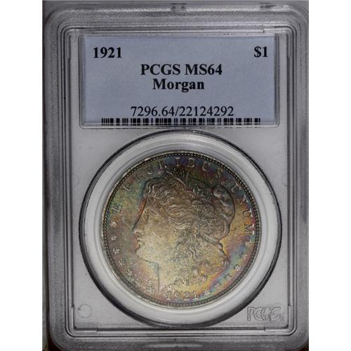 <B>1921<img border='0' src='http://www.heritagecoins.com/images/star.gif' width=10 height=10>$1 MS64 PCGS.</B></I> Deeply toned with exceptional eye appeal. The obverse has green, steel, lilac, gold, and amber colors while the reverse is similar but much deeper in overall appearance.