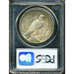 1921 S$1 MS64 PCGS. Pastel bluish, violet, olive, <B>1921 S$1 MS64 PCGS.</B></I> Pastel bluish, violet, olive, and gold colors visit lustrous surfaces. Light marks on Liberty's jaw and neck limit the grade. <BR><BR><B>Important notice:</B> Heritage usually auctions material at the rate of 200-250 lots per hour. On some occasions eBay Live bid software or the Internet may not be able to keep up with the pace of the auction. We recommend placing a realistic absentee bid now as insurance to avoid disappointment. Occasionally the auctioneer may eliminate or reject an eBay Live bid, and the auctioneer may also reopen a lot after the close of the eBay live bidding (usually because we missed an audience bid), and may reject your bid even if it shows you as the winning bidder. By bidding via eBay Live, you agree that Heritage may award the lot to another bidder at its sole discretion under the circumstances described above or any other reasonable circumstances. Since eBay bids are not shown to us until we open the lot on the floor, we treat those bids just like floor bids. In most cases the floor responds before the eBay bid is presented to us, due to Internet lag time, so for consistency we have made it a policy that floor bids are always considered first over tie eBay live bids. Also please note that all Heritage lots purchased through eBay Live carry a 20% Buyer's Premium. Please make sure you read the Terms and Conditions before you bid. This lot is being auctioned in conjunction with a live floor auction by Heritage Galleries & Auctioneers. All final auction and invoice information will be supplied by Heritage Galleries & Auctioneers, and all other information should be considered preliminary. Lot:7772