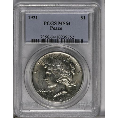 <B>1921<img border='0' src='http://www.heritagecoins.com/images/star.gif' width=10 height=10>$1> MS64 PCGS.</B></I> The mellow and largely untoned surfaces befit this first-year near-Gem. The strike is typical for the year. Limiting factors are small contact marks on Liberty's cheek and neck and several marks in the left obverse field.