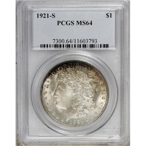 <B>1921-S $1 MS64 PCGS.</B></I> PCGS Population (2605/667). NGC Census: (4165/692). Mintage: 21,695,000. Numismedia Wsl. Price for NGC/PCGS coin in MS64: $132. (#7300)<BR><BR><b>Shipping:</b> Coins & Currency (<a target="_blank" href="http://www.heritageauctions.com/common/shipping.php">view shipping information</a>)
