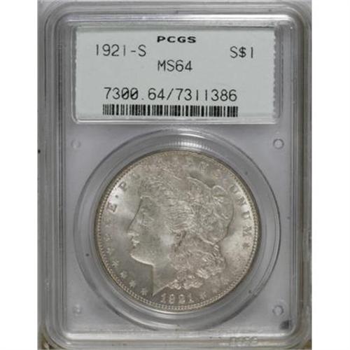 <B>1921-S $1 MS64 PCGS.</B></I> PCGS Population (2649/678). NGC Census: (4180/705). Mintage: 21,695,000. Numismedia Wsl. Price for NGC/PCGS coin in MS64: $132. (#7300)<BR><BR><b>Shipping:</b> Coins & Currency (<a target="_blank" href="http://www.heritageauctions.com/common/shipping.php">view shipping information</a>)