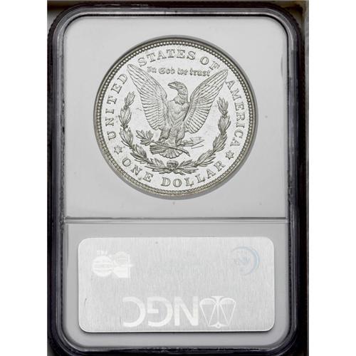<B>1921<img border='0' src='http://www.heritagecoins.com/images/star.gif' width=10 height=10>$1> MS64 Prooflike NGC.</B></I> Exquisite definition is noted on all of the design elements of this near-Gem Morgan. Faint speckles of milky-gray color are visible under magnification, as are some wispy obverse slidemarks.