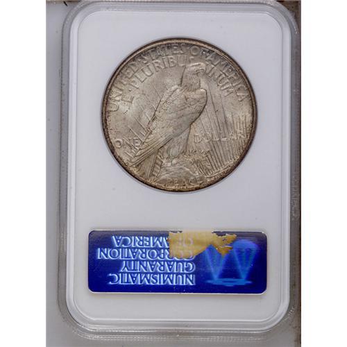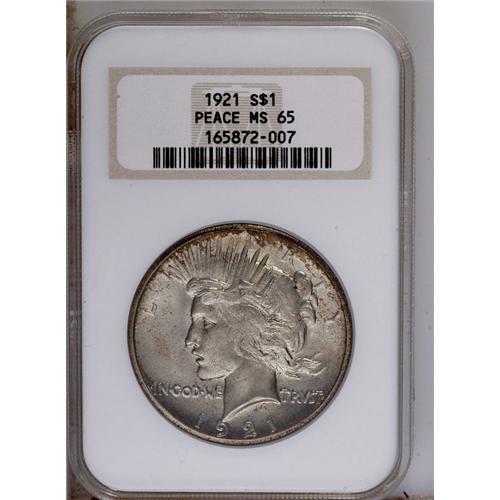 <B>1921<img border='0' src='http://www.heritagecoins.com/images/star.gif' width=10 height=10>$1> MS65 NGC.</B></I> A lustrous chestnut-gray introductory-year Peace dollar. The fields are refreshingly smooth, and the portrait shows only faint contact. Housed in an early generation holder.