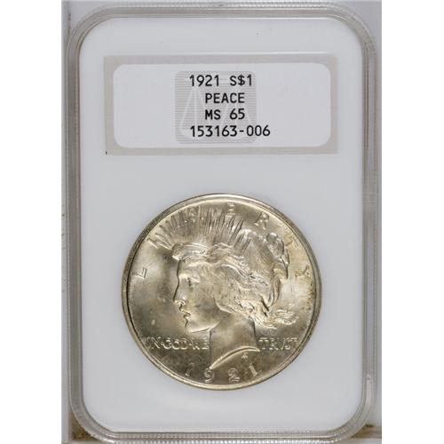 <B>1921 S$1 MS65 NGC.</B></I> Highly lustrous and frosty with occasional russet, crimson, or gold splashes on the otherwise silver-gray surfaces. Central striking weakness is noted on each side of this Gem.<BR><BR><b>Shipping:</b> Coins & Currency (<a target="_blank" href="http://www.heritageauctions.com/common/shipping.php">view shipping information</a>)