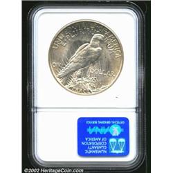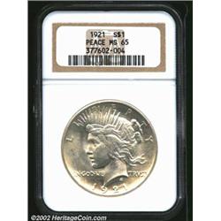 1921 S$1 MS65 NGC. Light apricot-gold patina hugs the margins. A lustrous Gem with a reasonable strike and exquisitely preserved fields. A short and faint pinscratch in the obverse center does not distract. There is a die lump (as struck) centered above the N in ONE, while a few clashmarks (as made) are visible below UNUM. Important notice: We expect to be auctioning lots at the rate of 200-250 per hour. Sometimes eBay Premier live bid software cannot keep up with that pace, so we strongly recommend that you place a realistic proxy bid now as insurance to avoid disappointment. Also please note that all Heritage/CAA lots purchased through eBay Premier carry a 20% Buyer's Premium. Please make sure you read the Terms and Conditions.