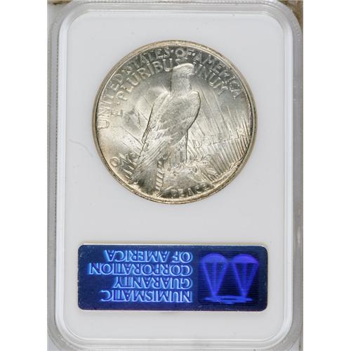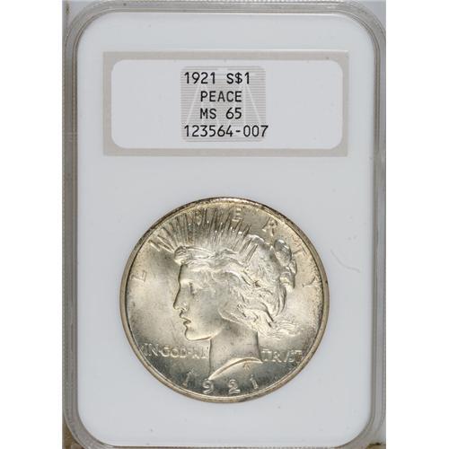 <B>1921 S$1 MS65 NGC.</B></I> Light gold patina enriches this lustrous and pleasing Gem. The obverse is exceptionally preserved, although the central strike is a bit soft, as generally seen. The dies are moderately rotated, which is unusual for this first-year issue. Encapsulated in a first generation holder.<BR><BR><b>Shipping:</b> Coins & Currency (<a target="_blank" href="http://www.heritageauctions.com/common/shipping.php">view shipping information</a>)