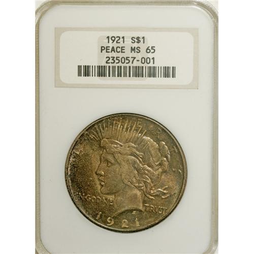 <B>1921 S$1 MS65 NGC.</B></I> The soft luster complements a palette of deep olive, rose-violet, and slate-gray. The centers exhibit the weakness so often found on this high-relief issue.<BR><BR><b>Shipping:</b> Coins & Currency (<a target="_blank" href="http://www.heritageauctions.com/common/shipping.php">view shipping information</a>)