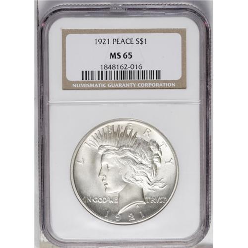 <B>1921<img border='0' src='http://www.heritagecoins.com/images/star.gif' width=10 height=10>$1> MS65 NGC.</B></I> Well struck with beautiful luster and exquisitely preserved surfaces that seem near-pristine on the obverse, and only show a few wispy marks on the reverse. Virtually inescapable flatness is noted on Liberty's hair detail, near the obverse center, but the remaining design elements are uniformly crisp. A lovely Gem example of this first year issue.