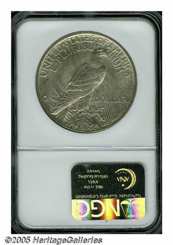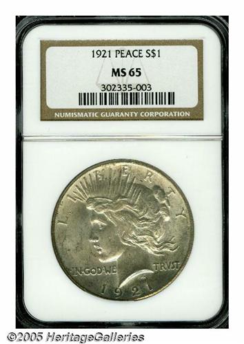 <B>1921<S$1> MS65 NGC.</B></I> Well struck with satin luster and a coating of opaque, subtly variegated patina on both sides. A few minor marks, on each side of the coin, occur mainly in the field areas.
