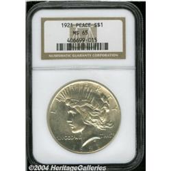 <B>1921<S$1> MS65 NGC.</B></I> This impressively preserved Gem displays even light-gray toning with excellent luster and unmarked, nearly pristine surfaces. A bit soft, as usual, in the centers. <BR><BR><B>Important notice:</B> Heritage usually auctions material at the rate of 200-250 lots per hour. On some occasions eBay Live bid software or the Internet may not be able to keep up with the pace of the auction. We recommend placing a realistic absentee bid now as insurance to avoid disappointment. Occasionally the auctioneer may eliminate or reject an eBay Live bid, and the auctioneer may also reopen a lot after the close of the eBay live bidding (usually because we missed an audience bid), and may reject your bid even if it shows you as the winning bidder. By bidding via eBay Live, you agree that Heritage may award the lot to another bidder at its sole discretion under the circumstances described above or any other reasonable circumstances. Since eBay bids are not shown to us until we open the lot on the floor, we treat those bids just like floor bids. In most cases the floor responds before the eBay bid is presented to us, due to Internet lag time, so for consistency we have made it a policy that floor bids are always considered first over tie eBay live bids. Also please note that all Heritage lots purchased through eBay Live carry a 20% Buyer's Premium. Please make sure you read the Terms and Conditions before you bid. </span></font></tr></table></td></tr></table>
