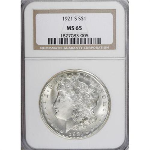 <B>1921-S $1 MS65 NGC.</B></I> Despite the strong mintages for the Morgan dollar issues of 1921, Gem S-mint pieces are elusive, partly due to striking problems. This example offers swirling luster and few post-strike marks, though the champagne-tinged portrait displays a number of tiny planchet marks on the unstruck cheek and temple and the eagle's breast.<BR><BR><b>Shipping:</b> Coins & Currency (<a target="_blank" href="http://www.heritageauctions.com/common/shipping.php">view shipping information</a>)