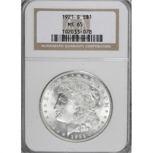 <B>1921-S $1 MS65 NGC.</B></I> A brilliant and lustrous example of this mintmarked final-year issue. The wreath is soft opposite Liberty's cap, but the centers have pleasing sharpness, and the only apparent abrasion is limited to the field above the eagle's head.<BR><BR><b>Shipping:</b> Coins & Currency (<a target="_blank" href="http://www.heritageauctions.com/common/shipping.php">view shipping information</a>)