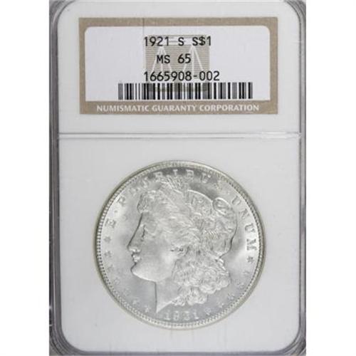 <B>1921-S $1 MS65 NGC.</B></I> . NGC Census: (653/47). PCGS Population (646/24). Mintage: 21,695,000. Numismedia Wsl. Price for NGC/PCGS coin in MS65: $750. (#7300)<BR><BR><b>Shipping:</b> Coins & Currency (<a target="_blank" href="http://www.heritageauctions.com/common/shipping.php">view shipping information</a>)