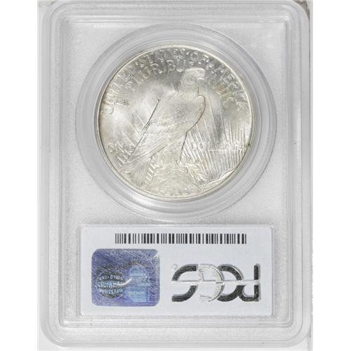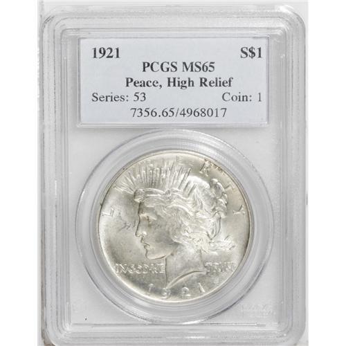 <B>1921<img border='0' src='http://www.heritagecoins.com/images/star.gif' width=10 height=10>$1> MS65 PCGS.</B></I> A highly lustrous Gem with wisps of ice-blue on the obverse and a patch of brick-red on the eagle's rock. Typically struck for this distinctive issue with a luster break in the left obverse field.